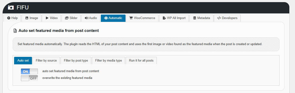 - FIFU 플러그인 설정 및 버전에 따라 'Set Featured Media from x image'와 같이 몇 번째 이미지를 대표 이미지로 사용할지 숫자를 입력하는 필드가 있을 수 있습니다. 기본값은 '1'이며, 이는 본문 내 첫 번째 이미지를 대표 이미지로 사용하겠다는 의미입니다.