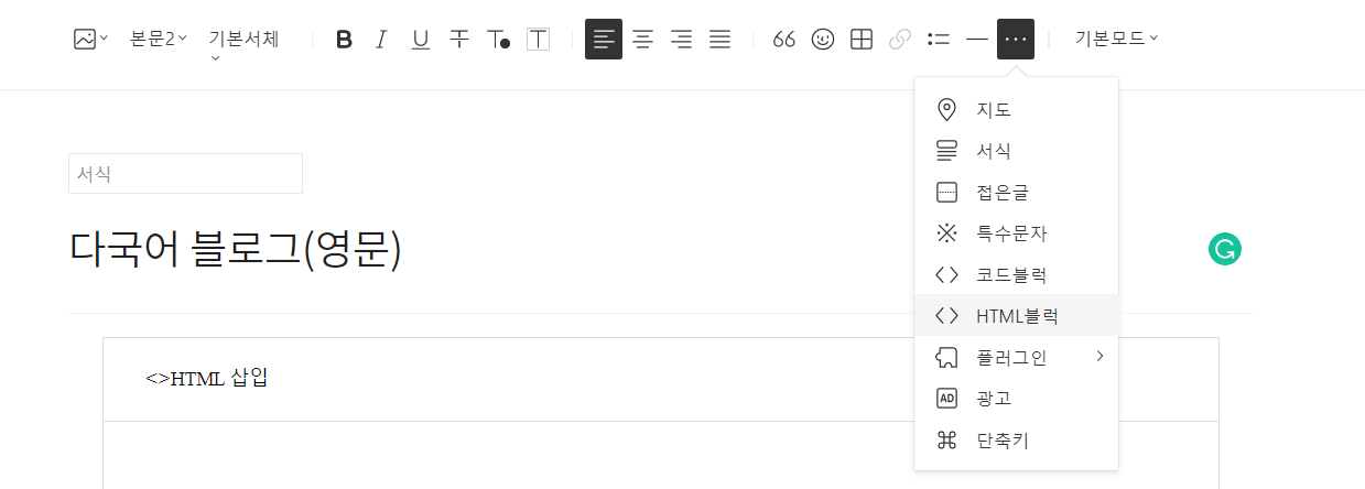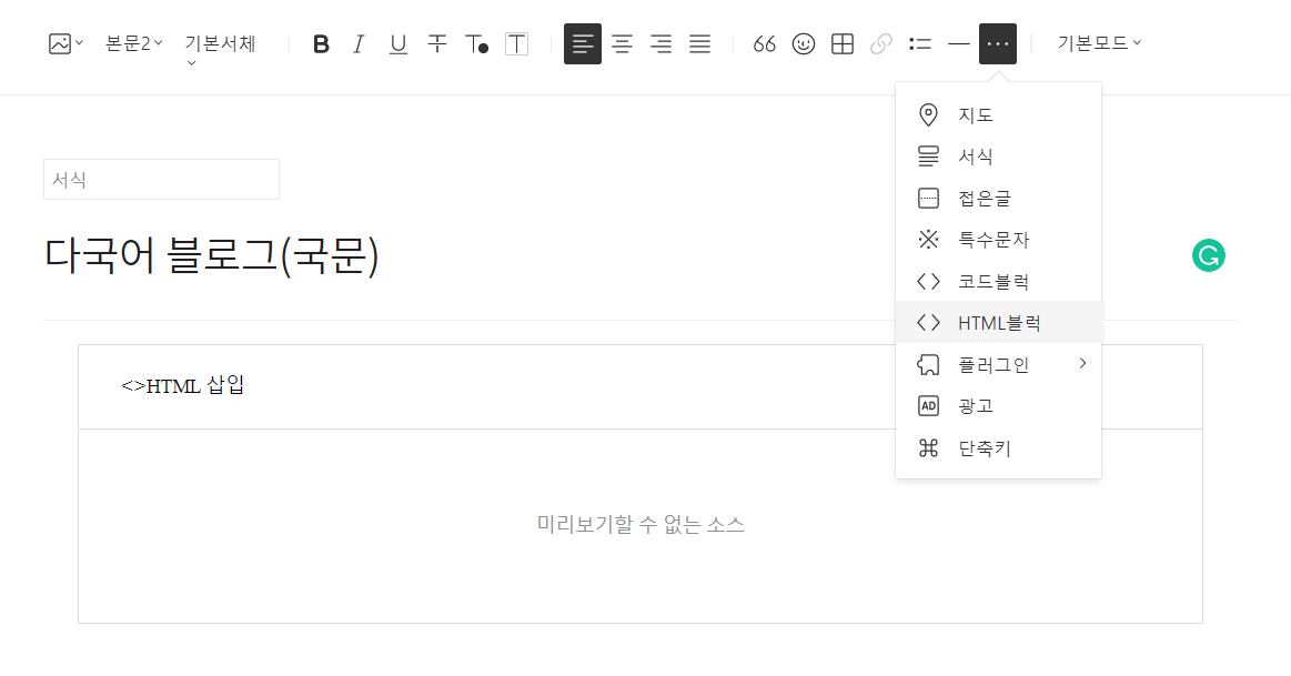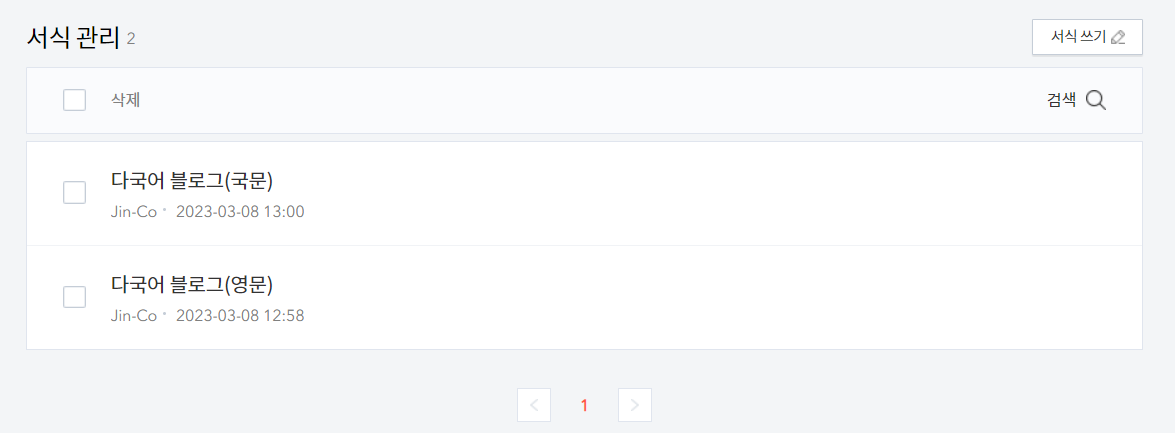 기존에 만들어 둔 다국어 블로그를 예시로 서식을 만들어 볼까요? '서식 쓰기'를 선택하면 아래처럼 일반 포스트 편집화면이 열립니다.