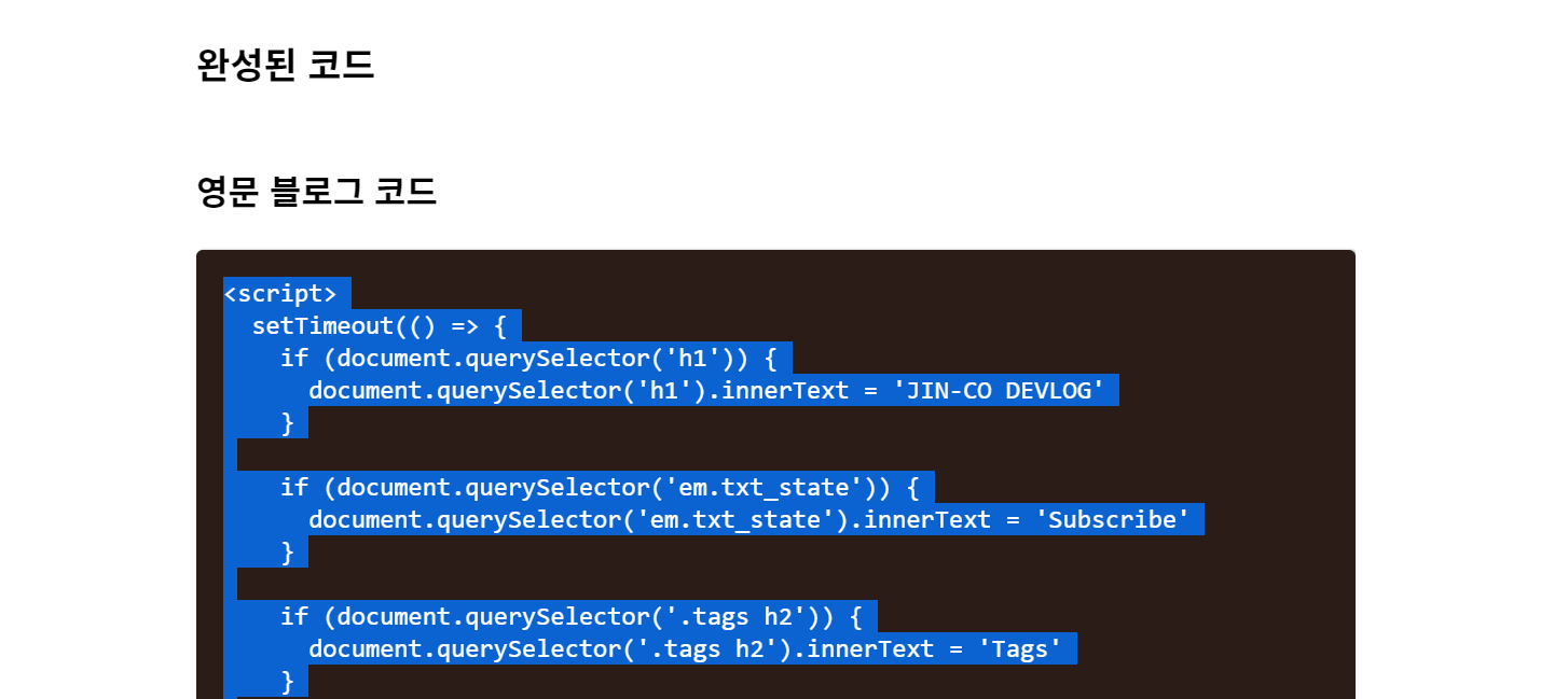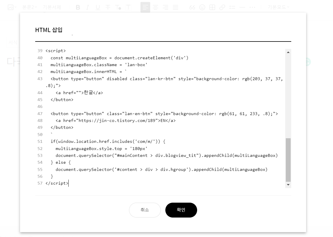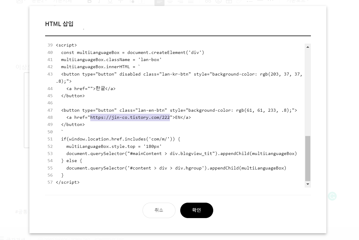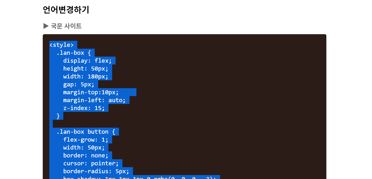 먼저, 다국어 블로그 포스트에서 필요한 코드를 복사 (언어변경과 이동링크 두 개 코드 필요)하고