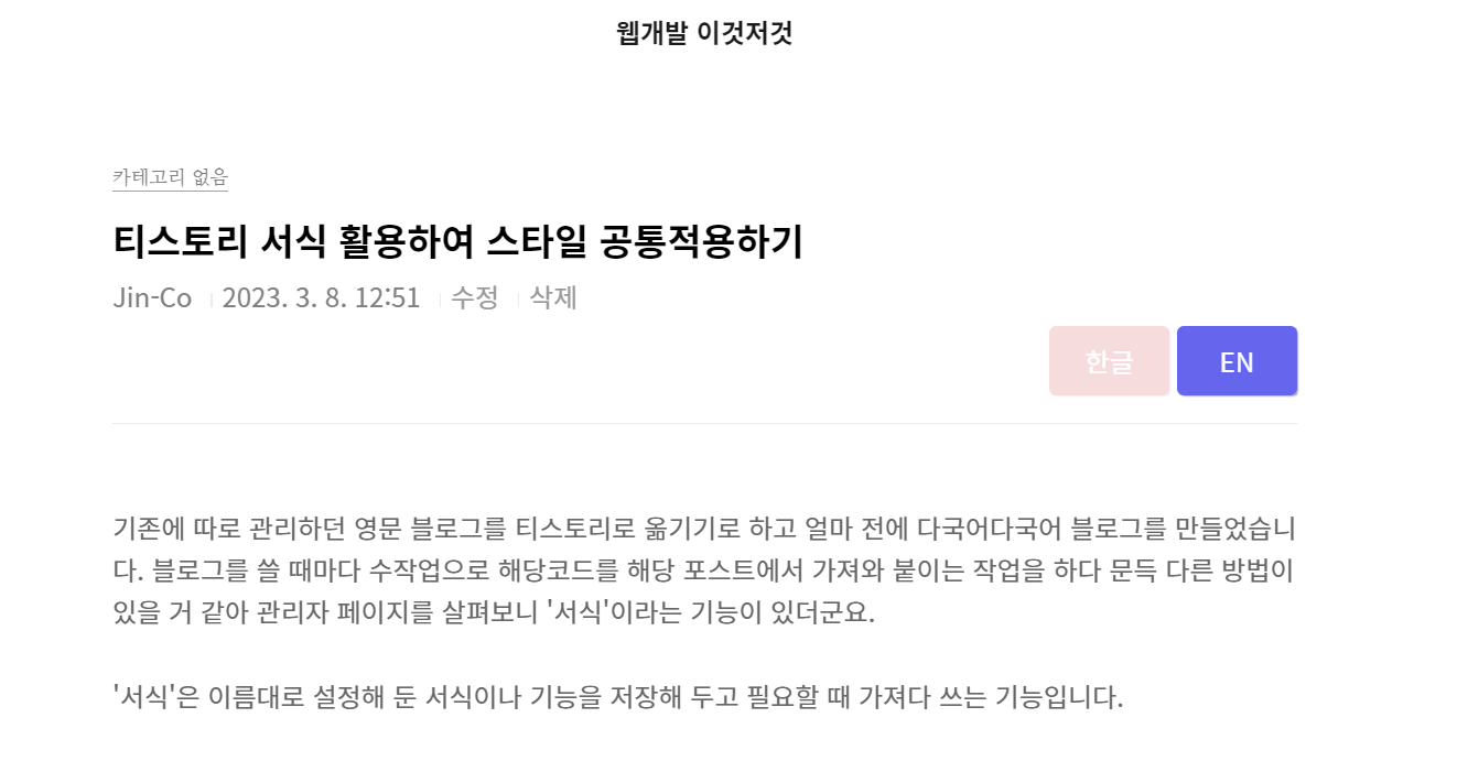 기존에 따로 관리하던 영문 블로그를 티스토리로 옮기기로 하고 얼마 전에 코드를 통해 다국어 블로그를 만들었습니다. 블로그를 쓸 때마다 수작업으로 해당코드를 해당 포스트에서 가져와 붙이는 작업을 하다 문득 다른 방법이 있을 거 같아 관리자 페이지를 살펴보니 '서식'이라는 기능이 있더군요.