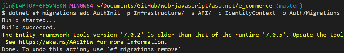 dotnet ef migrations add <MigrationName> -p Infrastructure/ -s API/ -c IdentityContext -o <Path>
