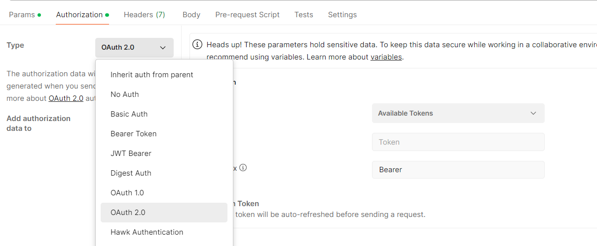 'Authorization' 탭으로 이동 후 'OAuth 2.0' 선택