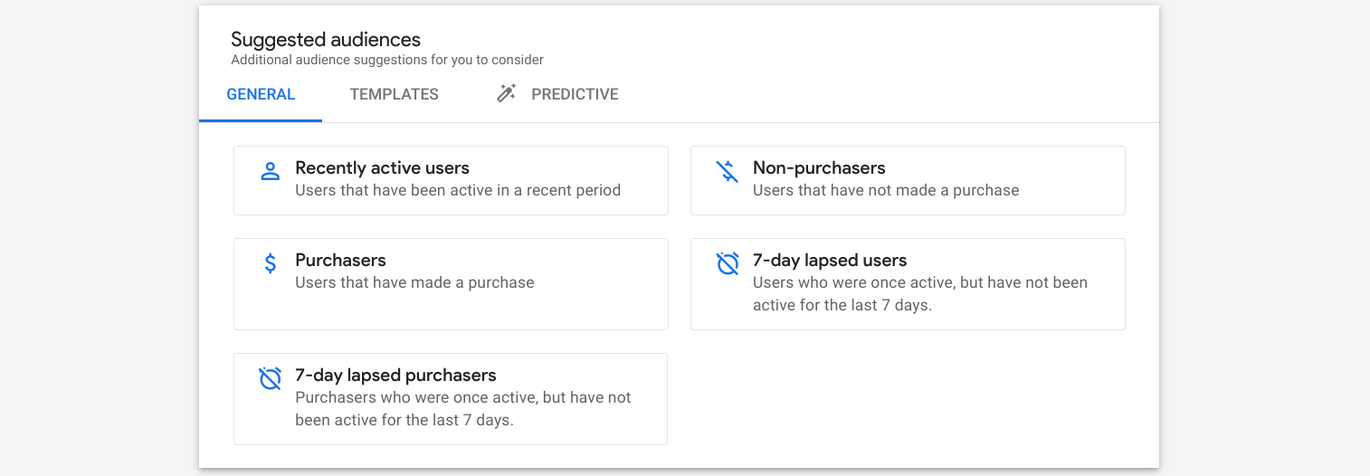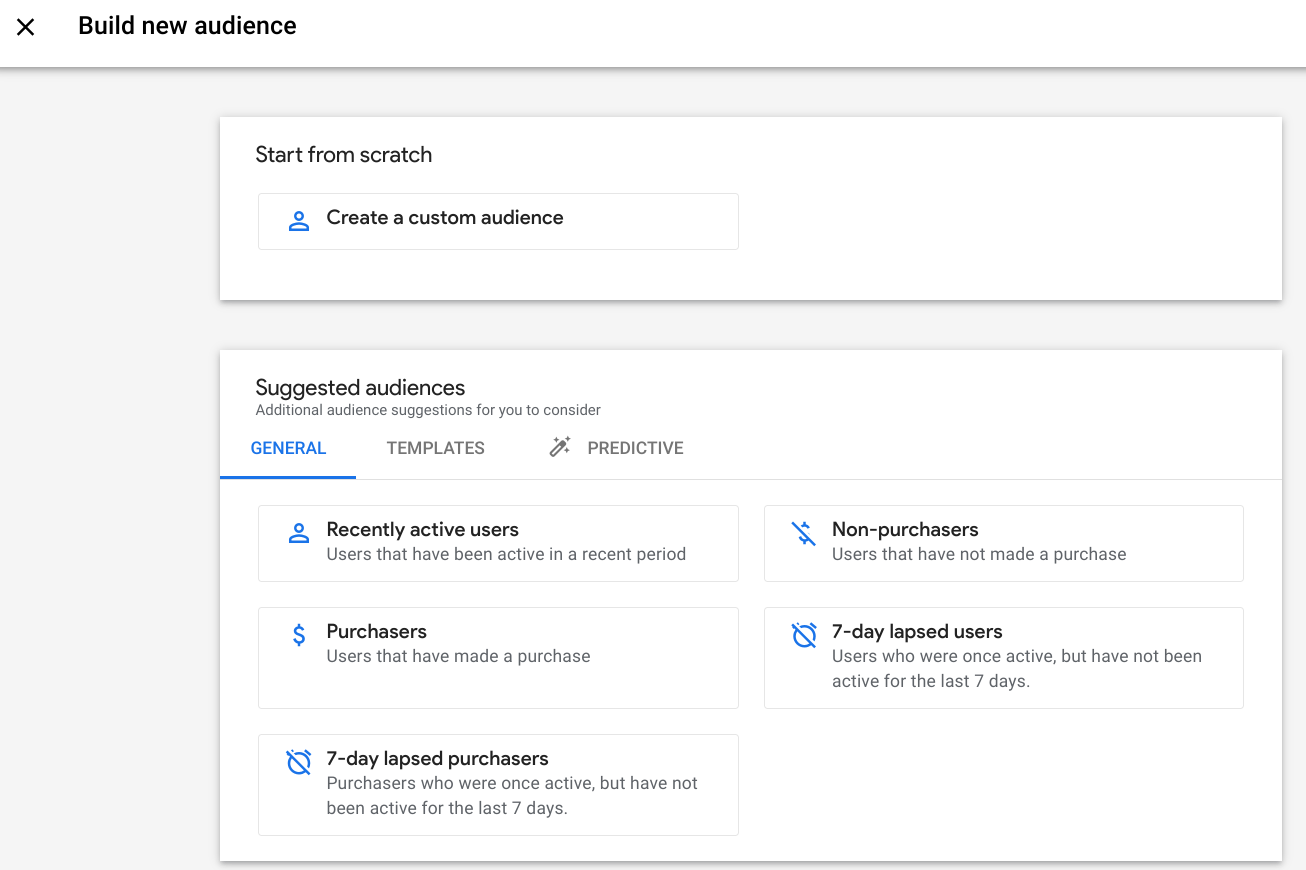 ‘All Users’ and ‘Purchaser’ are provided by default. Click ‘New audience’