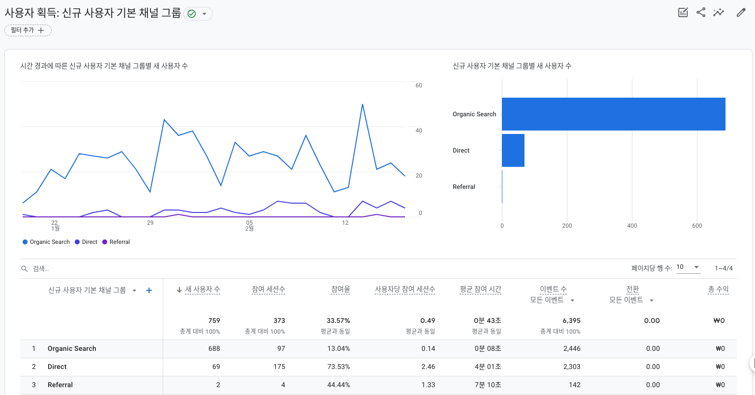 획득 보고서는 개요, 사용자 획득, 트래픽 획득으로 나뉘며 사이트로 유입되는 (새) 사용자들이 어떠한 경로로 들어왔는지 이해하는데 도움을 줍니다.