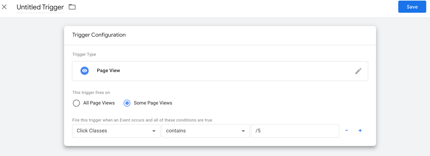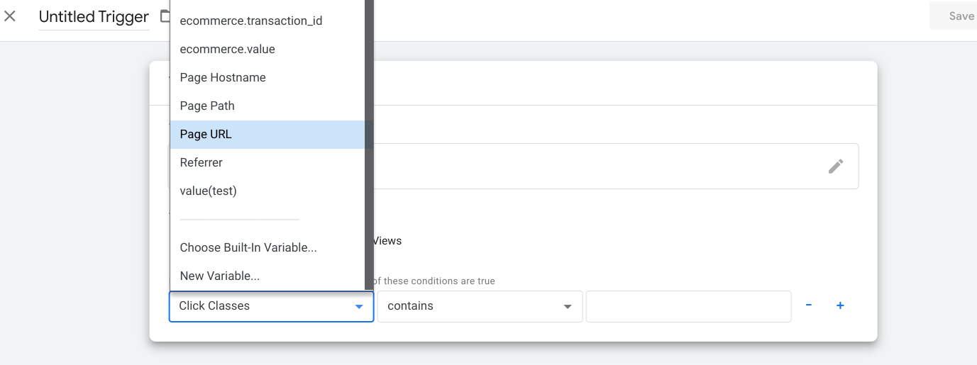 Leave the second box as 'contains' (A reason for that is to prevent this trigger not firing when advertisement identifier is appended to the URL when a user lands on the website through advertisement). Paste the URL in the third box and click 'save'
