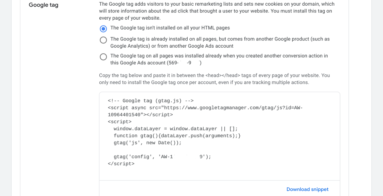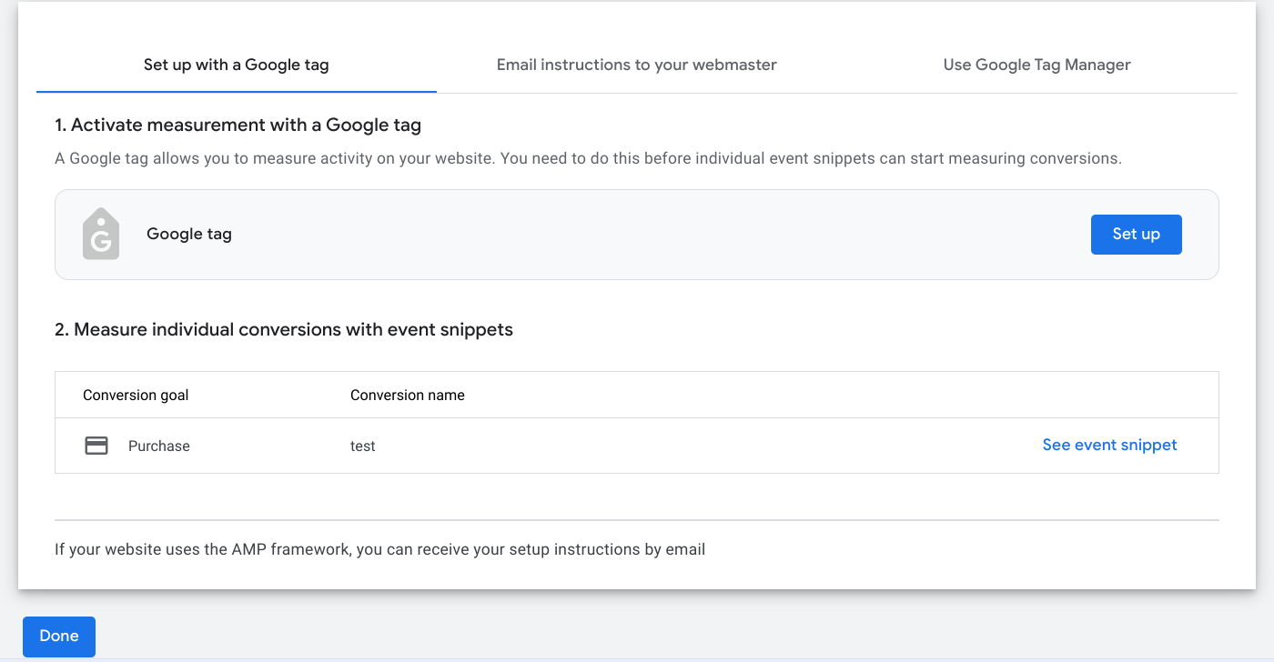 2. Manual: the conversion tag is inserted either by itself or through the GTM (Google Tag Manager)