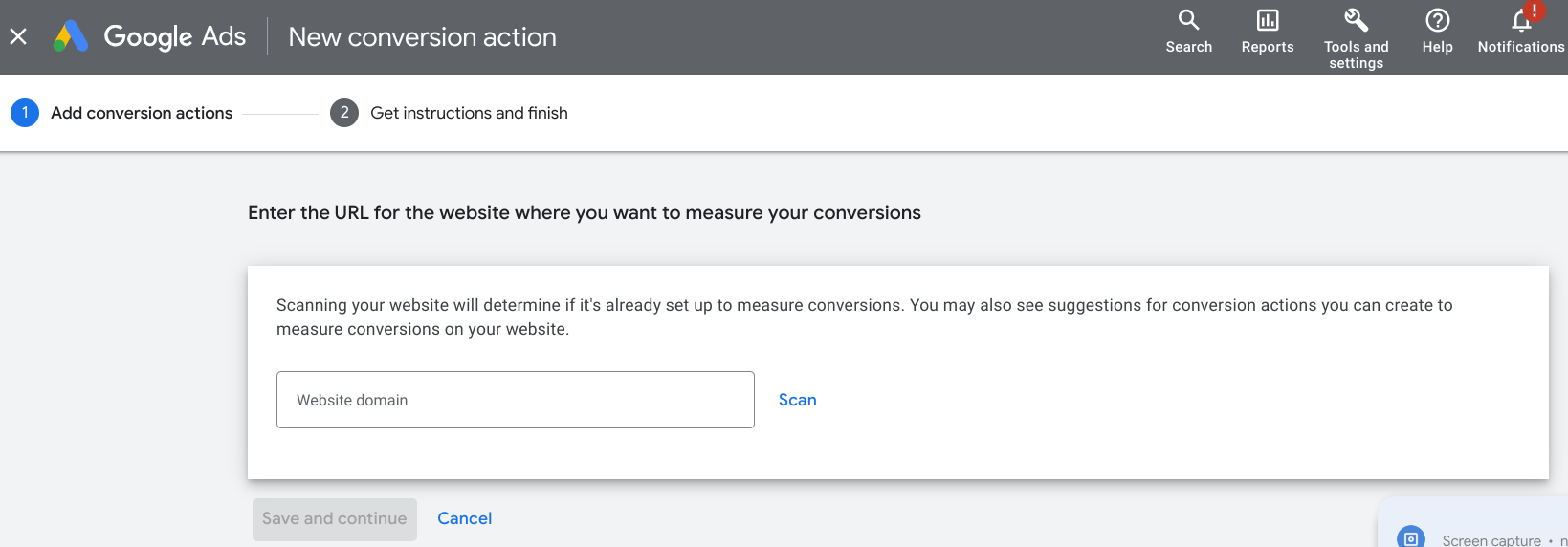 Afterscanning your website URL, go to the bottom and click ‘+ Add a conversion action manually’