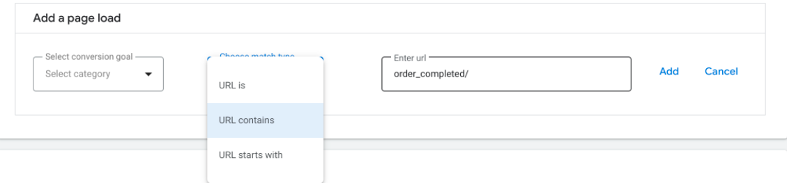 Secondly, for the ‘match type’, consider using either ‘contains’ or ‘starts with’ as your URL will have 'gclid' (an ID to identify each customer) appended in the URL when coming from clicking the advertisement.