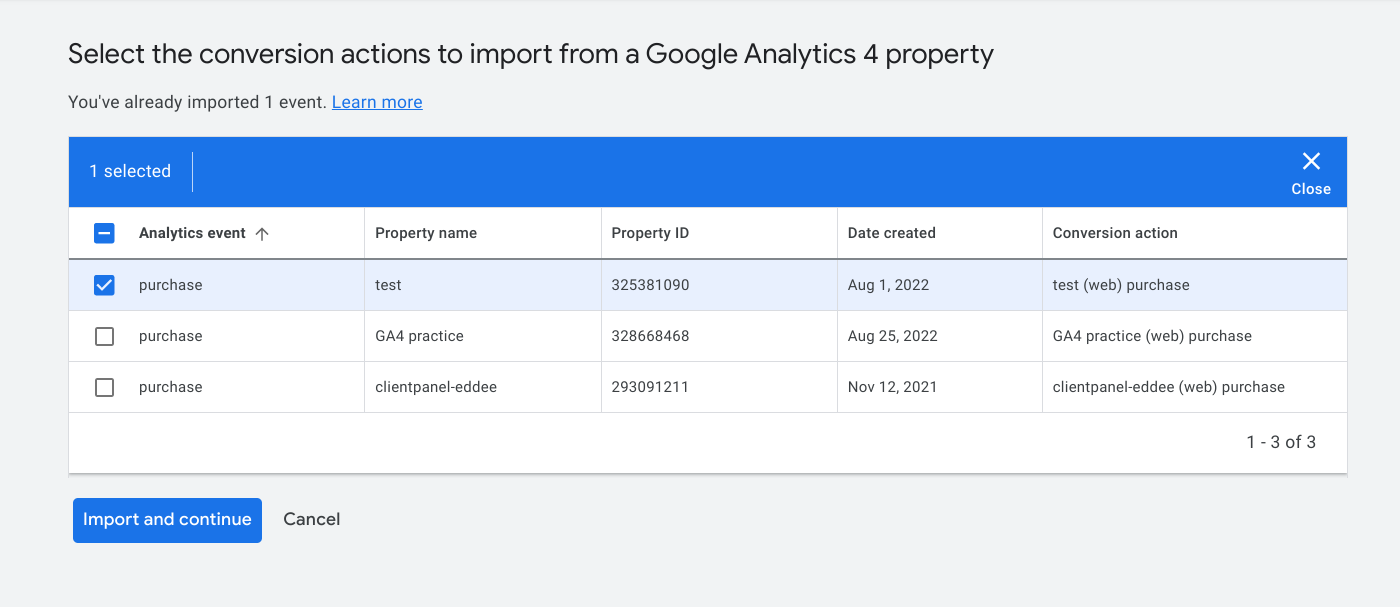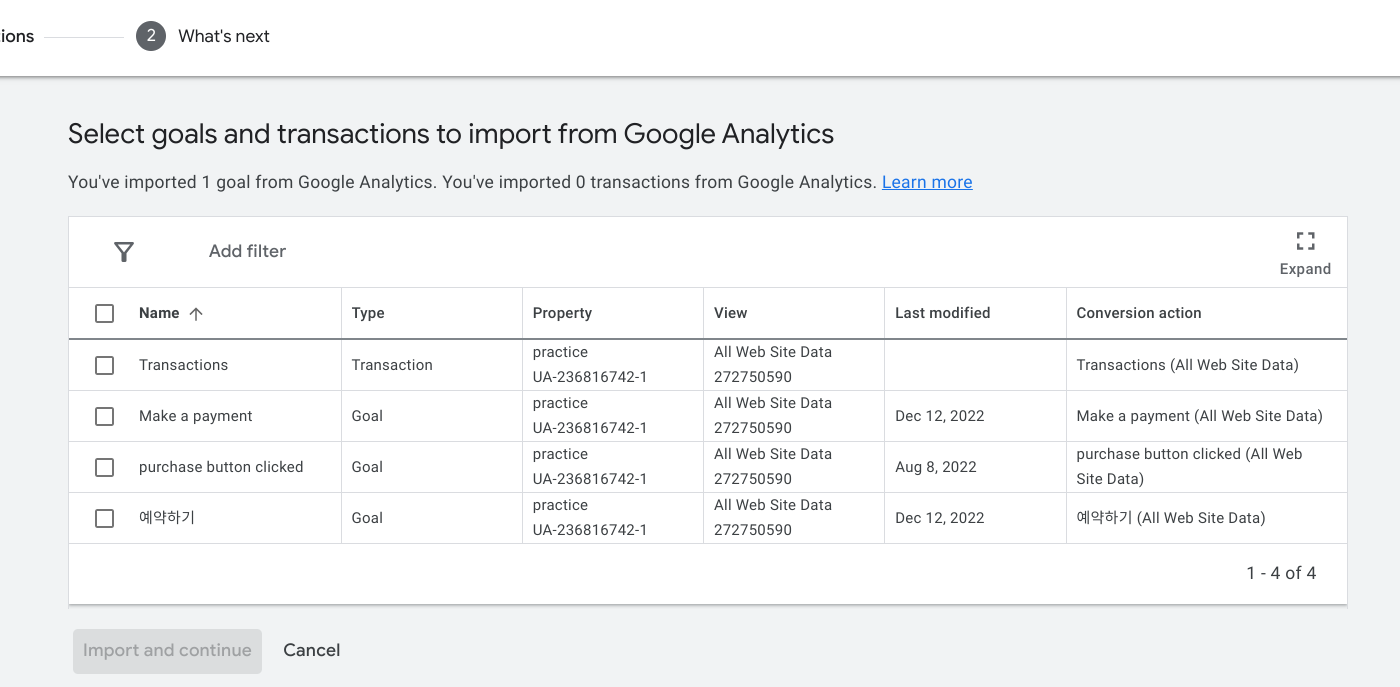 Select the conversions you want to bring in and click 'continue'