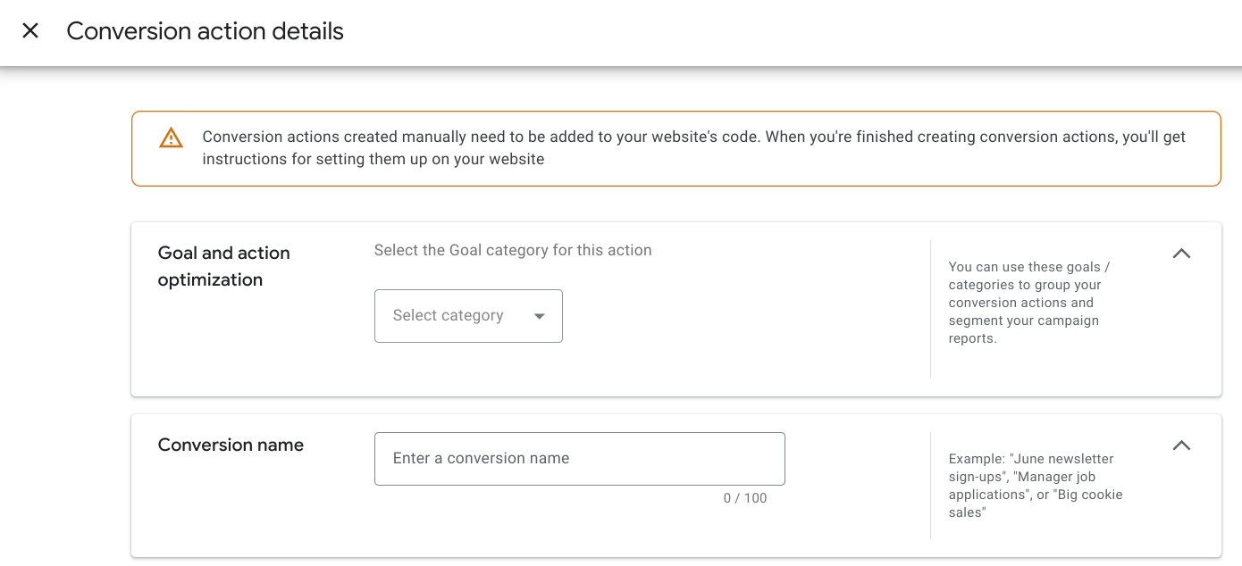 - Manual: the conversion tag is inserted either by itself or through the GTM (Google Tag Manager)