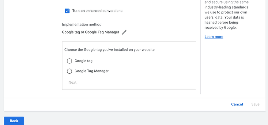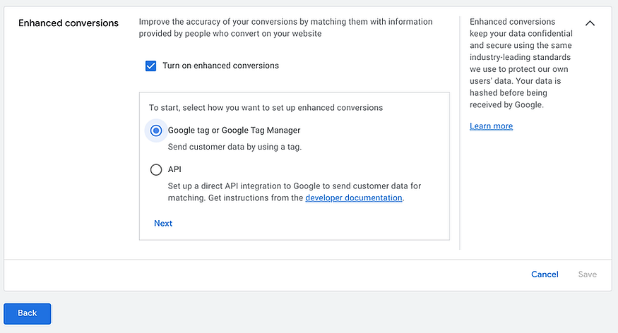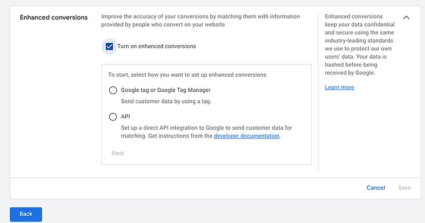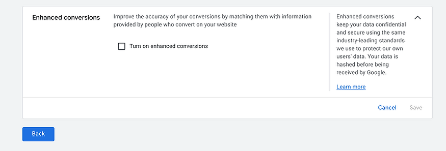 Click and open the ‘Enhanced conversions’ box at the bottom