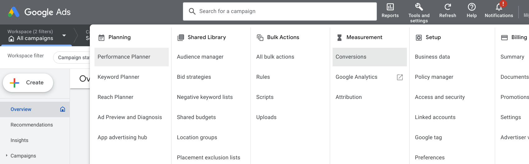 First, let’s move to the conversion page. To do so click ‘tools and settings’ menu on the top menu in your Google Ads account