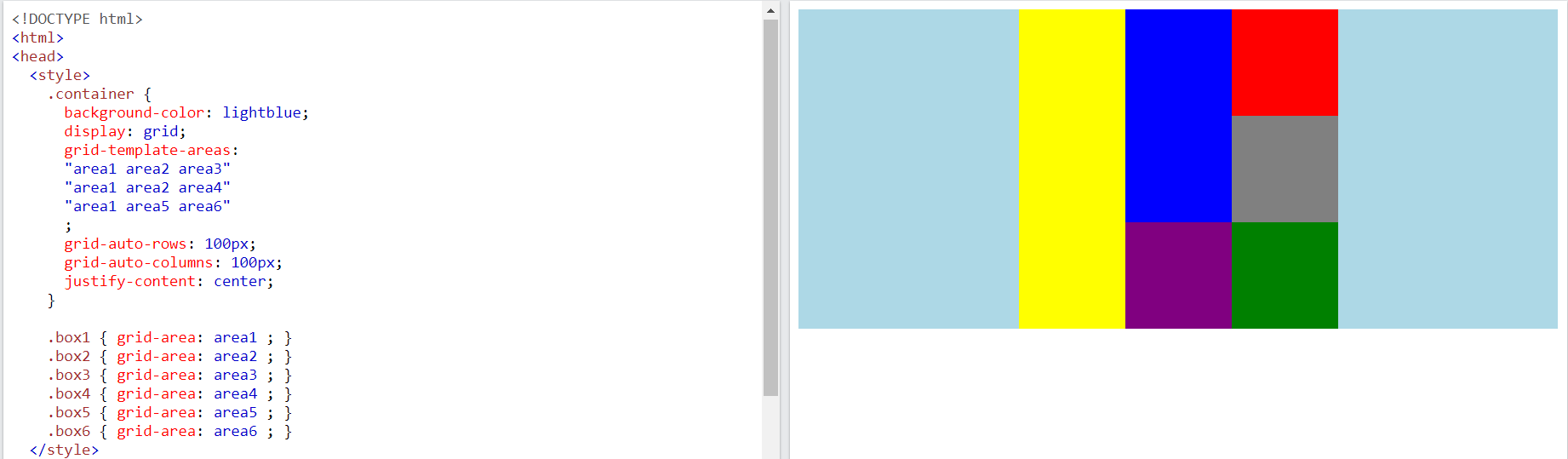 - grid-area: grid-template-area에 지정된 레이아웃에 들어갈 박스를 지정 (박스에서 지정)