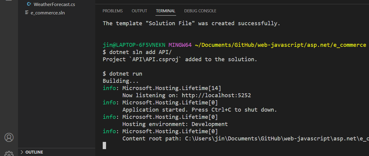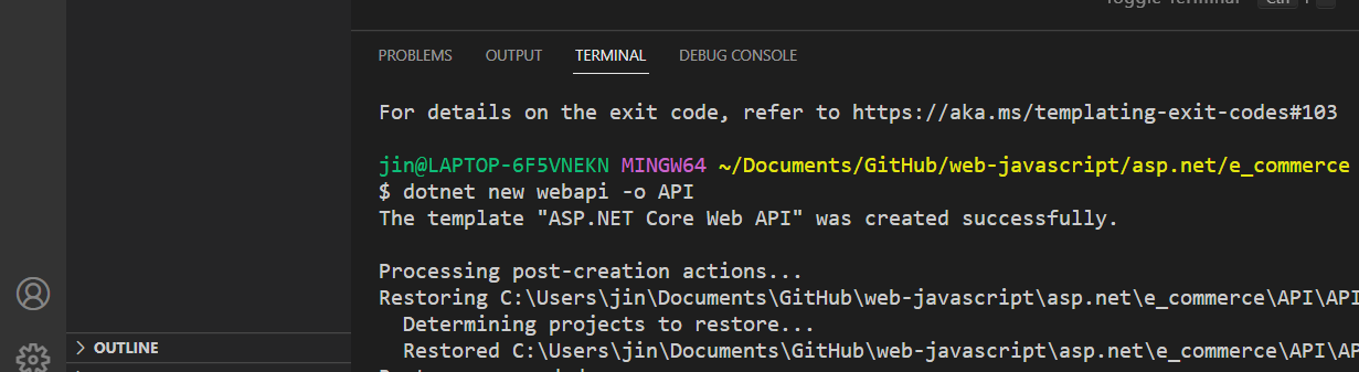 After that add a web API with the command below. '-o' option specifies a path to where the created project will be stored.