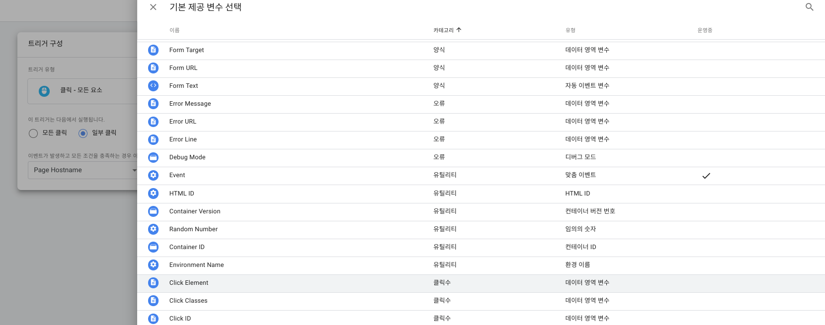 '일부 클릭' 선택 후 '기본 제공 변수 선택' 선택