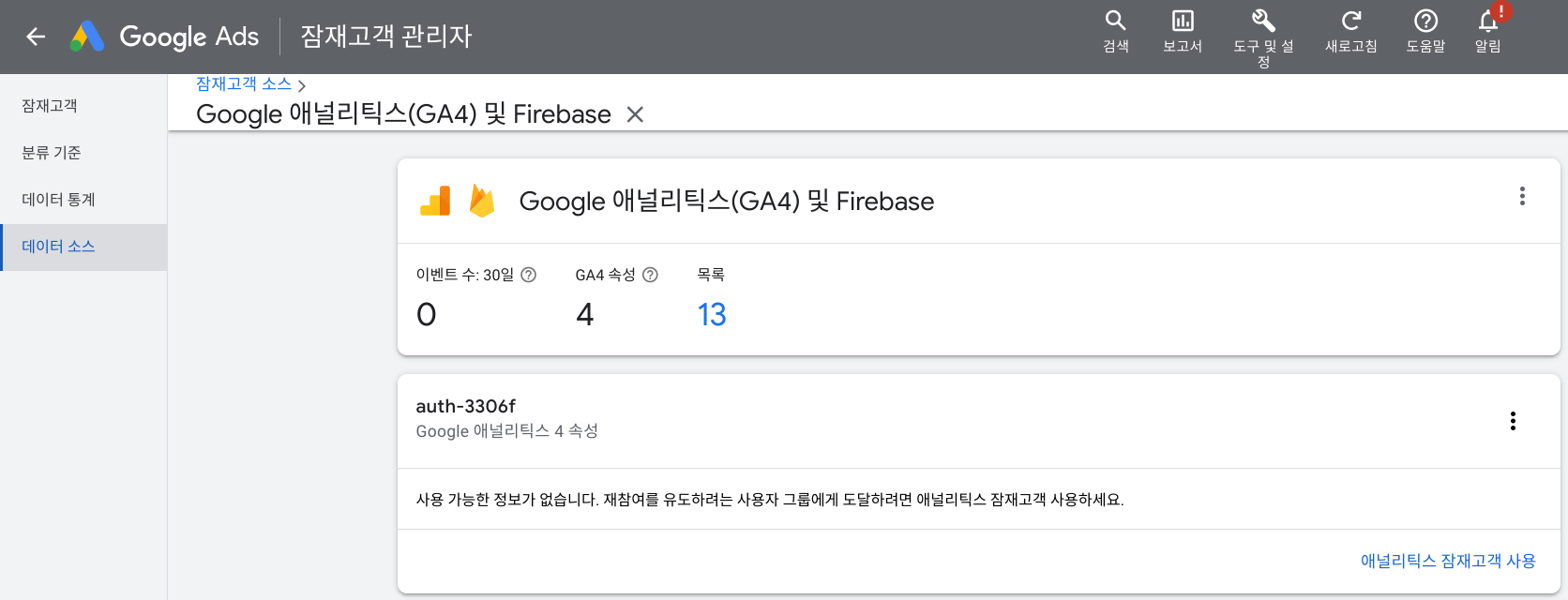 생성된 잠재고객을 가져오는 것만 아니라 구글애즈에서 새로운 연결된 애널리틱스 잠재고객을 생성하는 것도 가능합니다. 해당 기능을 사용하기 위해서는 애널리틱스 상에 연결된 애즈 계정권한이 마케터 이상이어야 합니다.