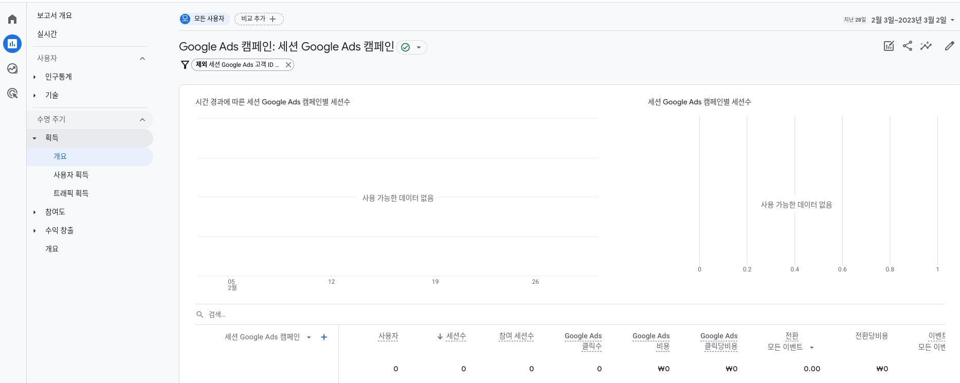 구글애즈에 생성된 캠페인을 애널리틱스 획득 보고서에서 확인가능합니다.
