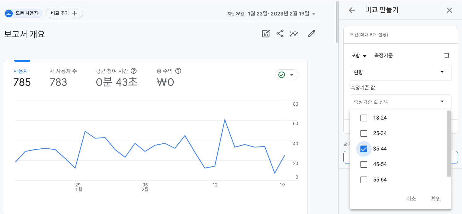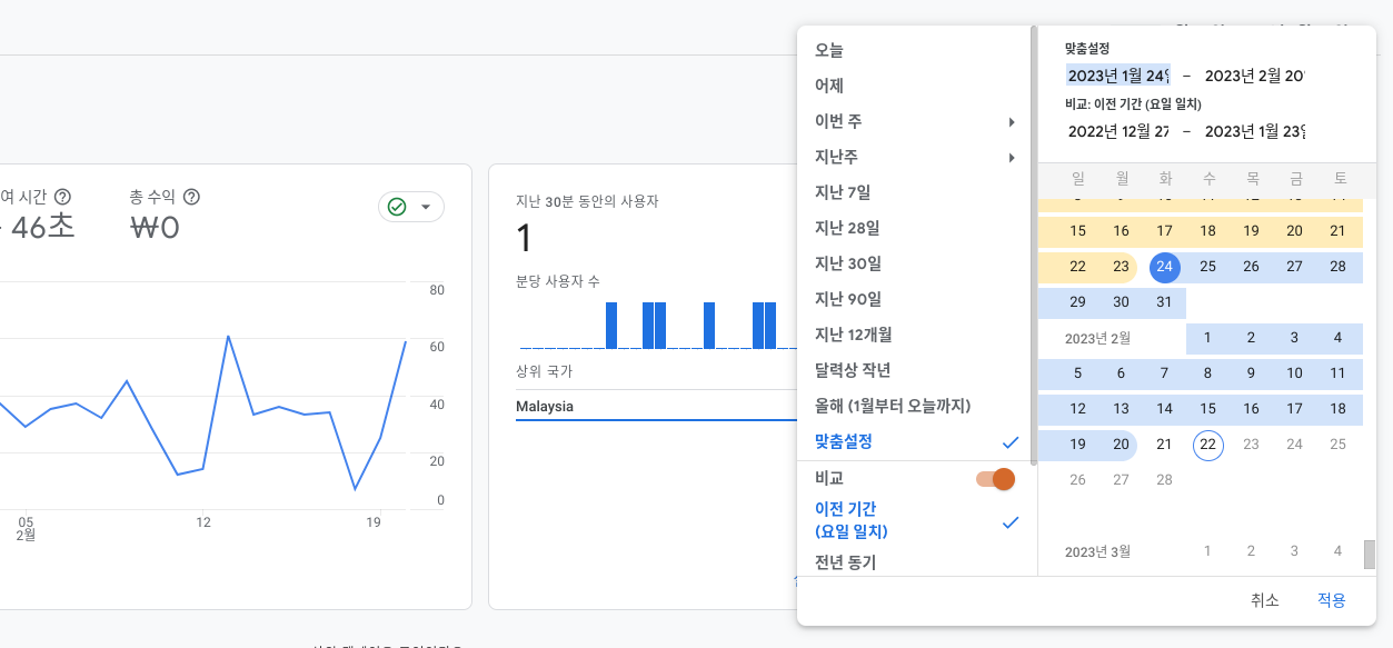 또 두 가지 기간을 지정하여 비교하는 것도 가능합니다. 아래처럼 비교 버튼을 켜고 '적용'을 하면