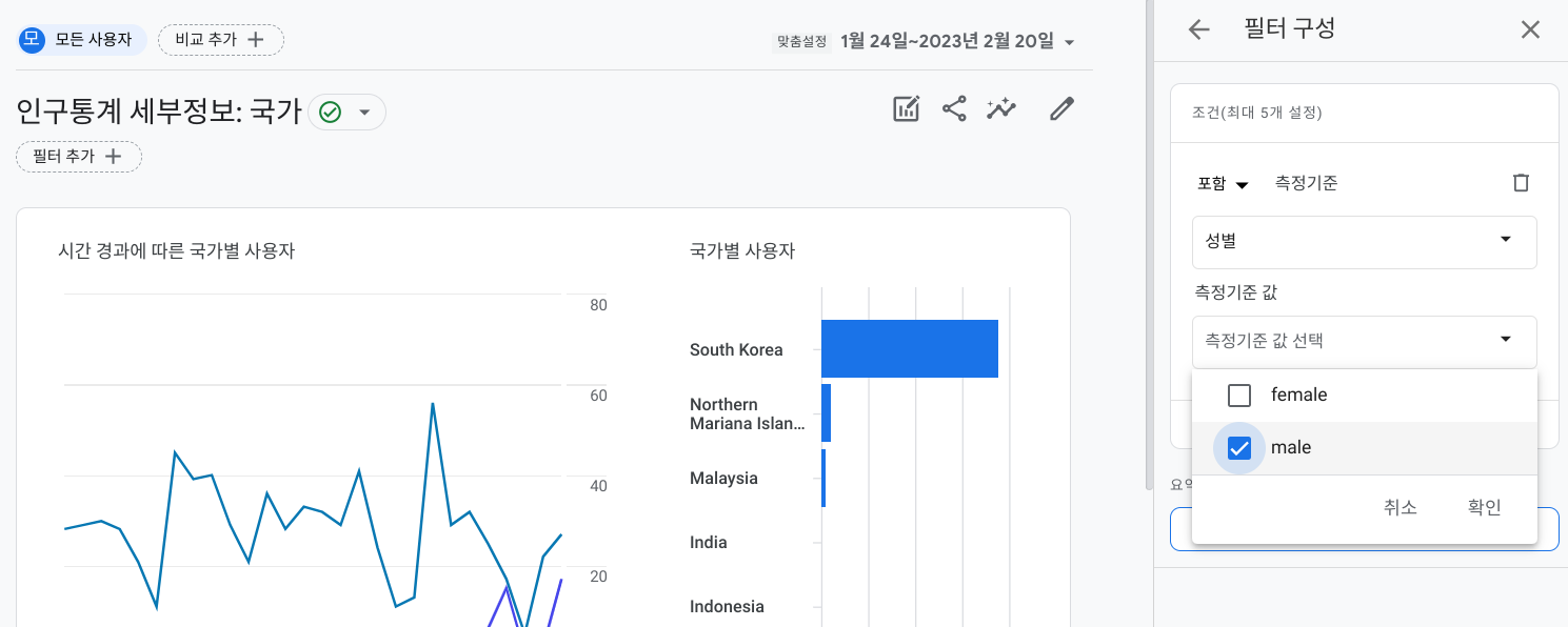 필터는 각 세부보고서에서 지정하여 특정 데이터를 제외하는 기능을 합니다 (개요는 필터기능 없음). 적용하는 방법은 대동소이하므로 인구통계 세부정보를 통해 설정해 보겠습니다.