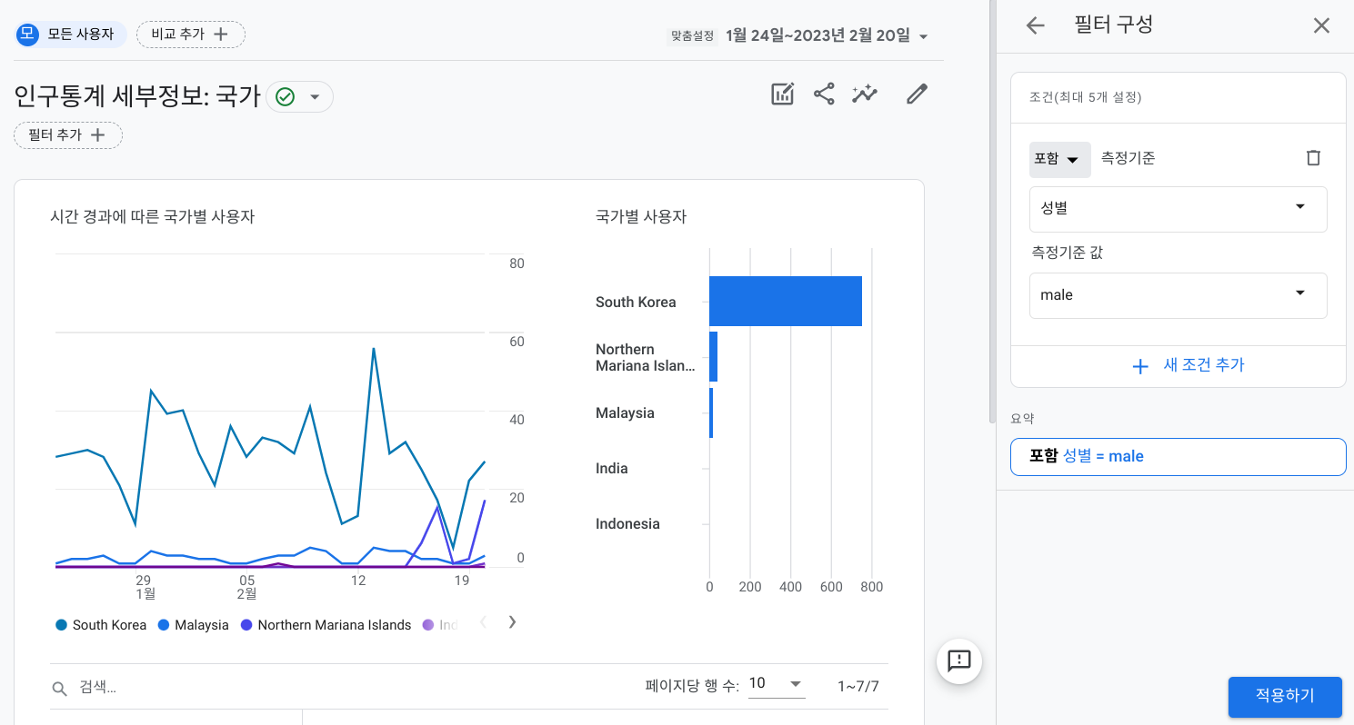 완료가 되면 아래처럼 적용된 필터를 확인 가능합니다. 적용된 필터는 해당 보고서를 떠나면 사라집니다. 설정한 필터를 포함한 보고서는 맞춤보고서 생성으로 가능합니다.