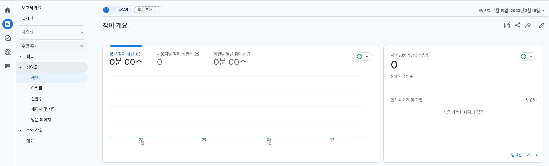 그럼, 각 보고서를 살펴보겠습니다. 보고서는 보고서 개요, 실시간, 사용자, 수명 주기로 구성되며 사용자, 수명 주기 보고서의 각 토픽은 세부보고서에 대한 보고서 개요를 제공합니다.