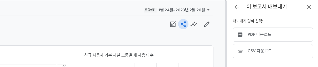 보고서 상단에 공유아이콘을 통해 보고서의 공유, 다운로드 (내보내기)가 가능합니다.