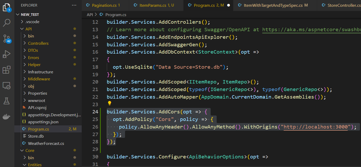 Go to the Program.cs file, add a middleware that uses the Cors service we set above. This must come after the service and before the 'app.UseAuthorization();' clause.