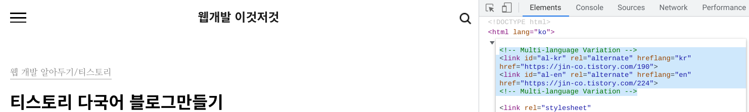 티스토리에서 만든 다국어 블로그를 가지고 해당 기능을 구현해 보겠습니다. 관리자 화면에서 '블로그 관리' -> '스킨편집' -> 'HTML 편집' -> 'HTML' 순으로 이동하여 아래처럼 'alternate' 링크 태그를 삽입합니다.