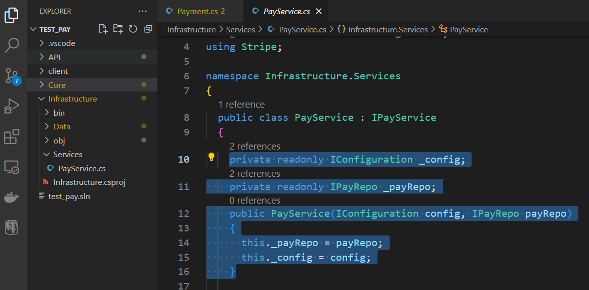 구현 클래스를 생성하고 컨스트럭터를 추가한 뒤 필요한 기능들을 인젝션 합니다 (IConfiguration은 설정한 환경변수 사용을 위해 필요).