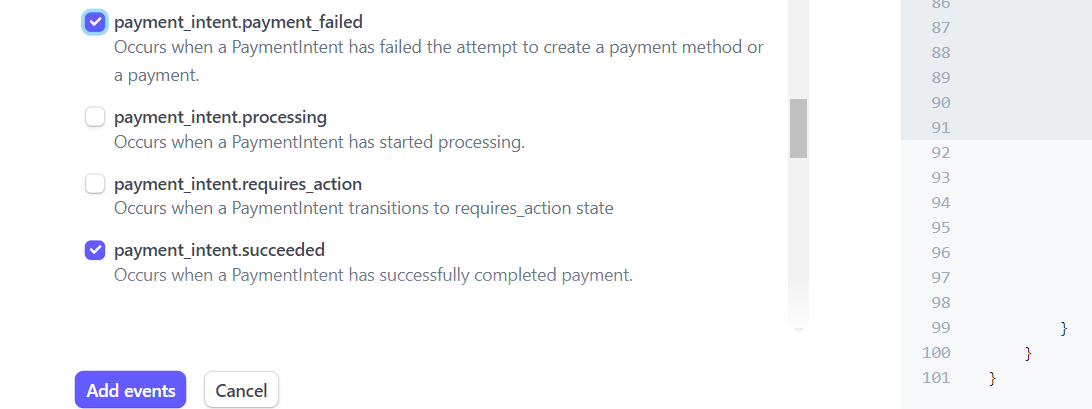 페이성공과 실패 이벤트 선택 후 저장 버튼 (add evetns) 누름