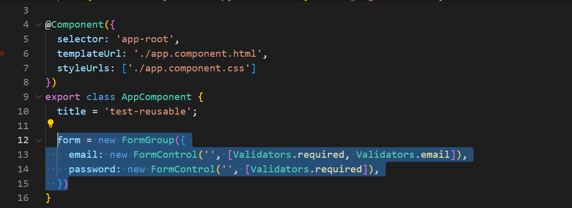 생성한 컴포넌트 클래스 파일에 폼 컨트롤과 돔요소를 연결하는 인터페이스를 구현합니다