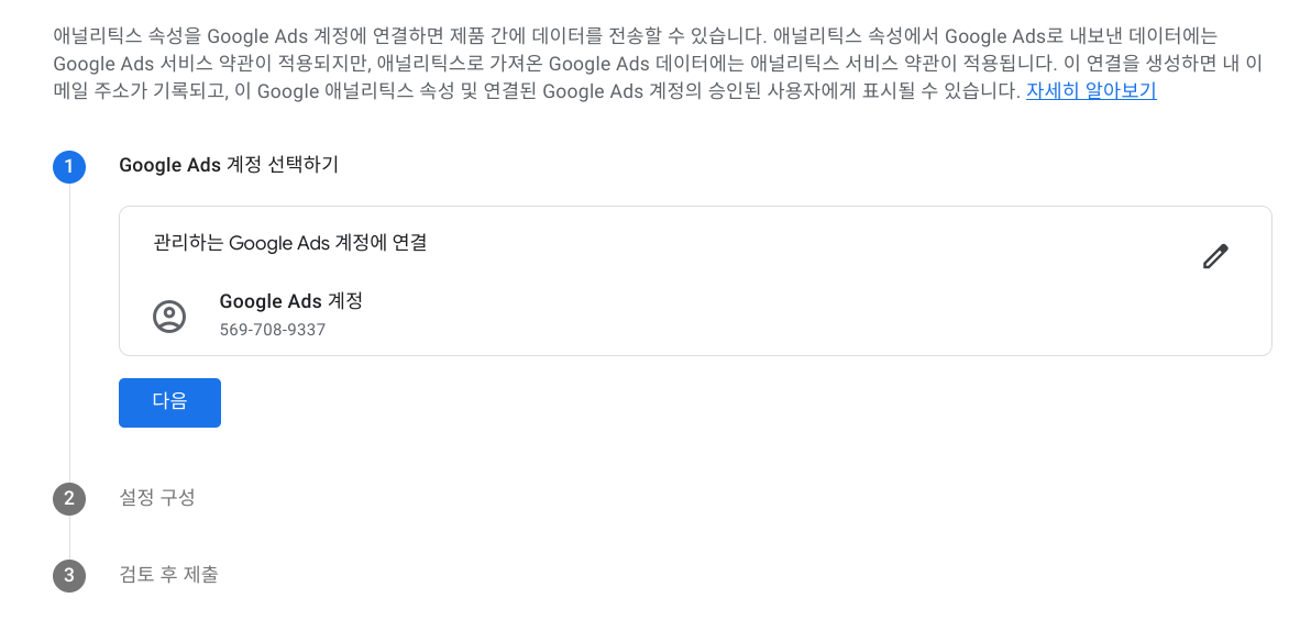 연결 가능한 구글 애즈 계정(같은 지메일을 사용하는 계정)이 뜨는데 체크 후 '계속' 선택