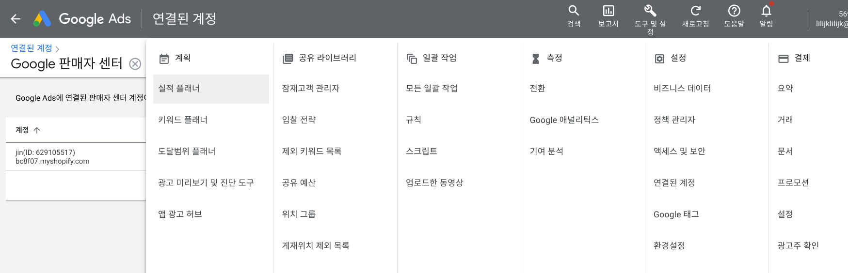 구글 애즈 계정에서 상단 메뉴 '도구 및 설정' -> '설정' 항목에 '연결된 계정' 선택
