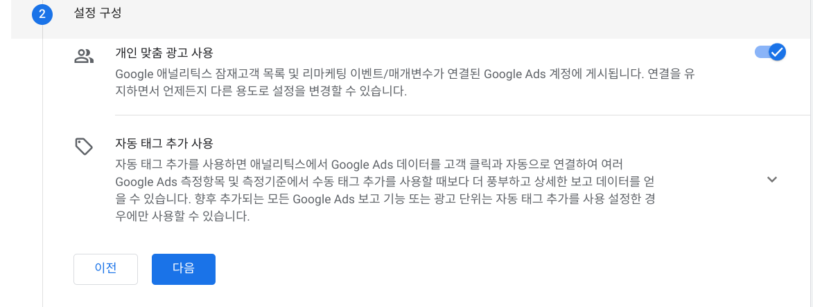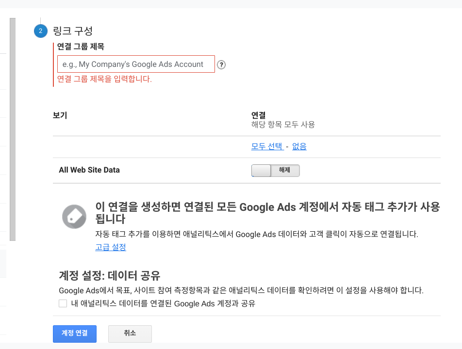 구글 애즈와 달리 설정할 수 있는 부분이 많이 보이는데요. 제목 외는 모두 선택사항이나, '보기' 선택 없이 연결할 경우 잠재고객 정보만 구글애즈에서 확인이 가능하는 등 제한이 있기 때문에 모든 설정사용을 권장합니다.