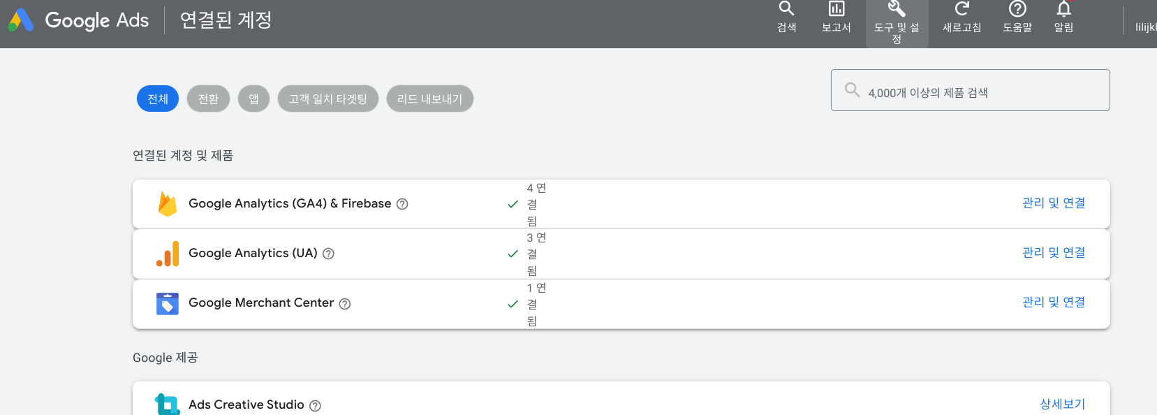 각 제품마다 설정에 연결하는 메뉴가 있는데요. 먼저, 구글 애즈에서 다른 제품들과 연결하는 방법을 알아볼까요.