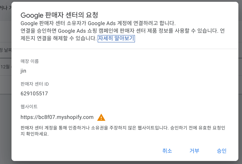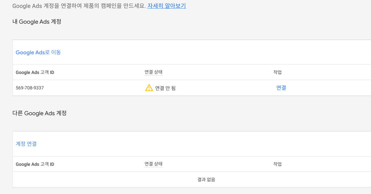 구글 애즈랑 머천트센터 연결은 머천트센터에서 요청을 보내야 하기 때문에 연결방법이 한 가지입니다.