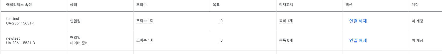 같은 지메일 계정 아래의 UA 속성 목록이 뜨는데, 연결하고자 하는 속성의 '링크'를 누릅니다.