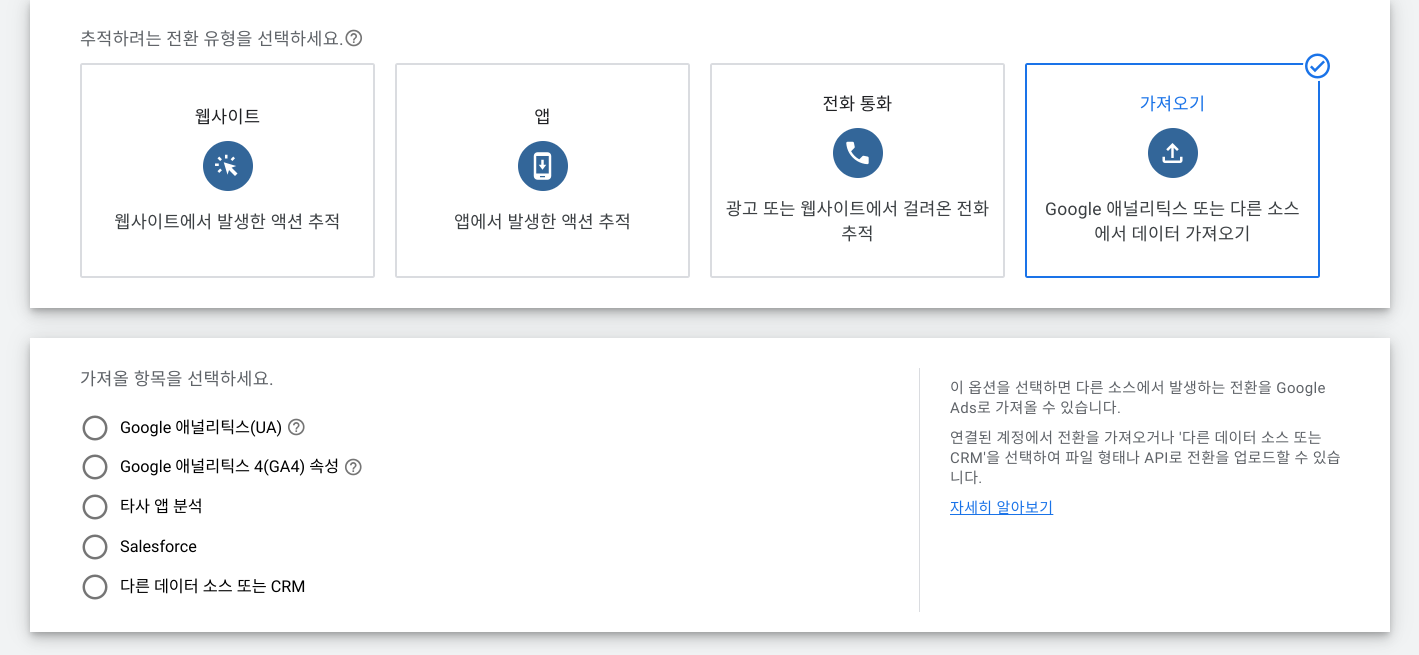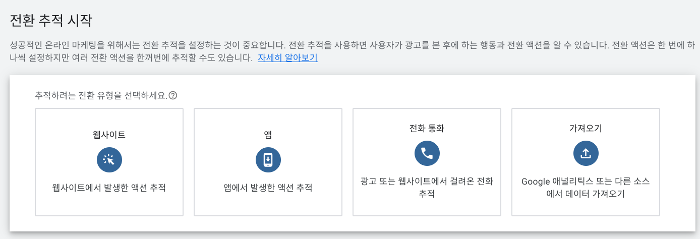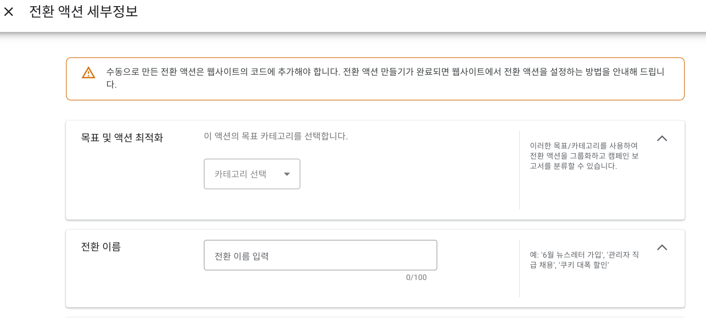 - 수동: 수동 태그 삽입으로 전환액션 감지. 삽입방법은 직접삽입 또는 GTM (구글 태그관리자) 사용