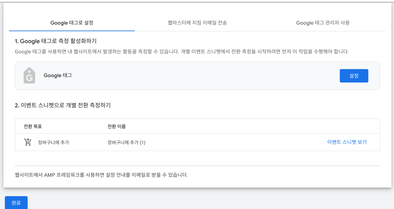 이렇게 설정을 완료하고 사이트에 구글애즈 글로벌태그 삽입하면 자동전환 설정이 완료됩니다.