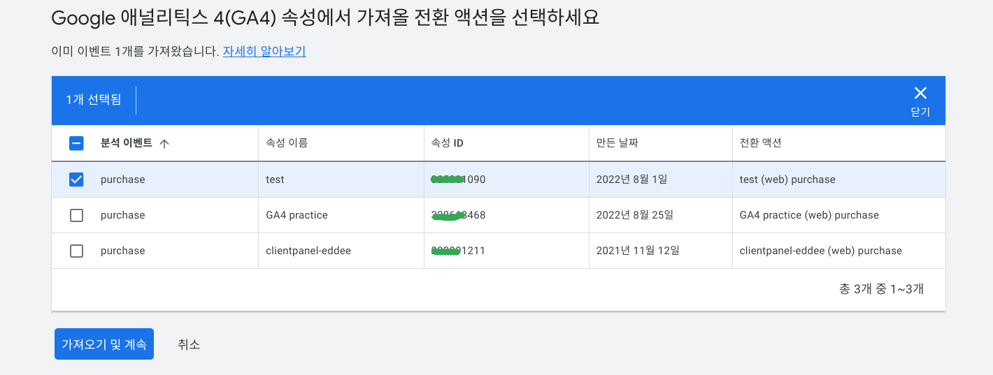 가져올 전환을 선택하고 '가져오기 및 계속'을 누릅니다.