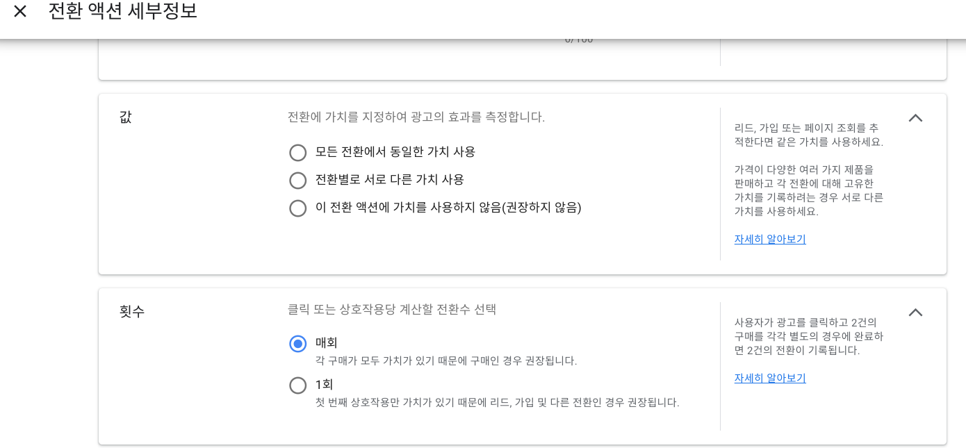 값 (전환이 가지는 금전적 가치)과 횟수 (같은 사용자가 수차례 전환 액션 생성 시 모두 감지할지 한 번만 감지할지 여부) 설정