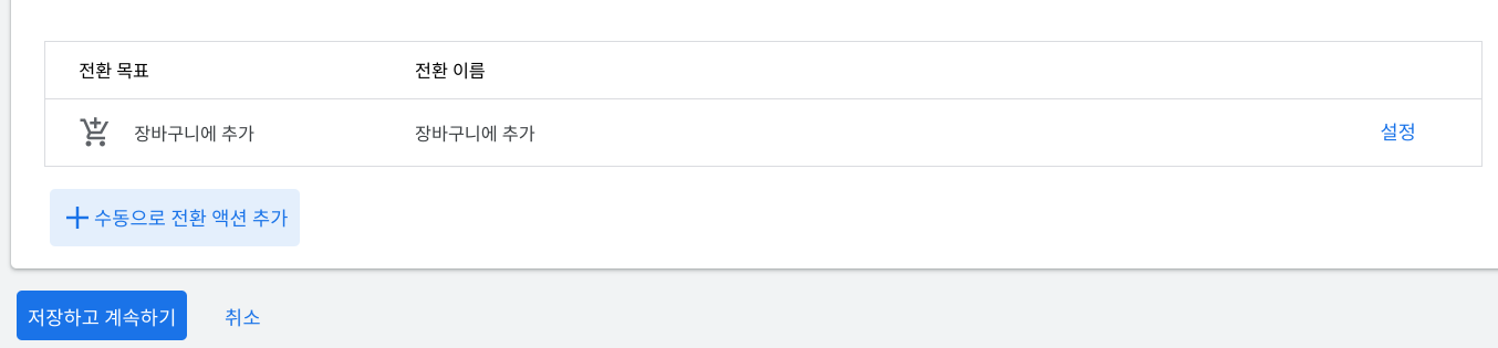 이후, 생성된 전환이 목록에 추가되는데요. 필요한 만큼 추가 생성 후 하단에 '저장하고 계속하기'를 클릭