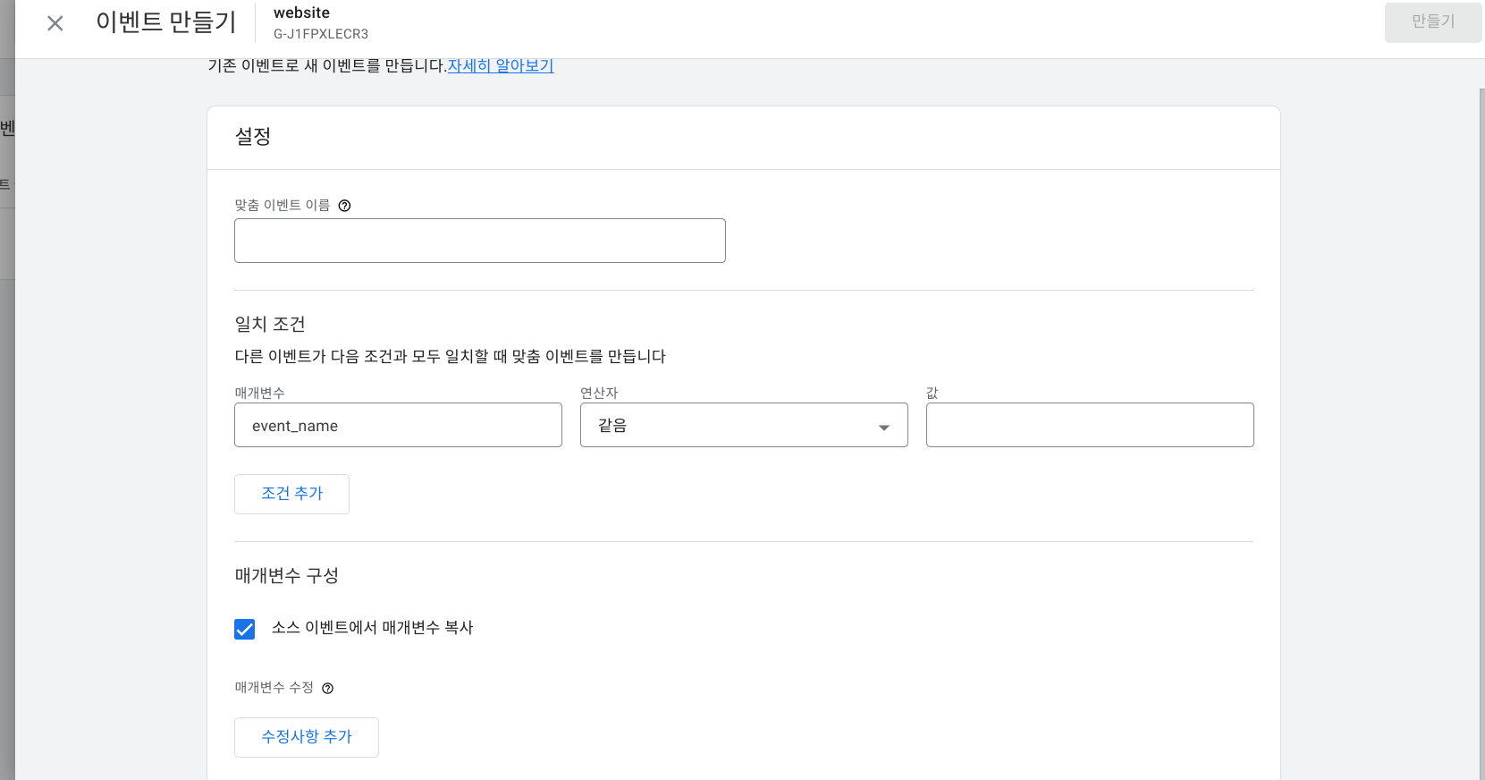 열린 화면에서 다시 '만들기'를 누르고 이벤트 이름과 발생조건이 되는 이벤트 값을 입력하고 '만들기'를 누릅니다.