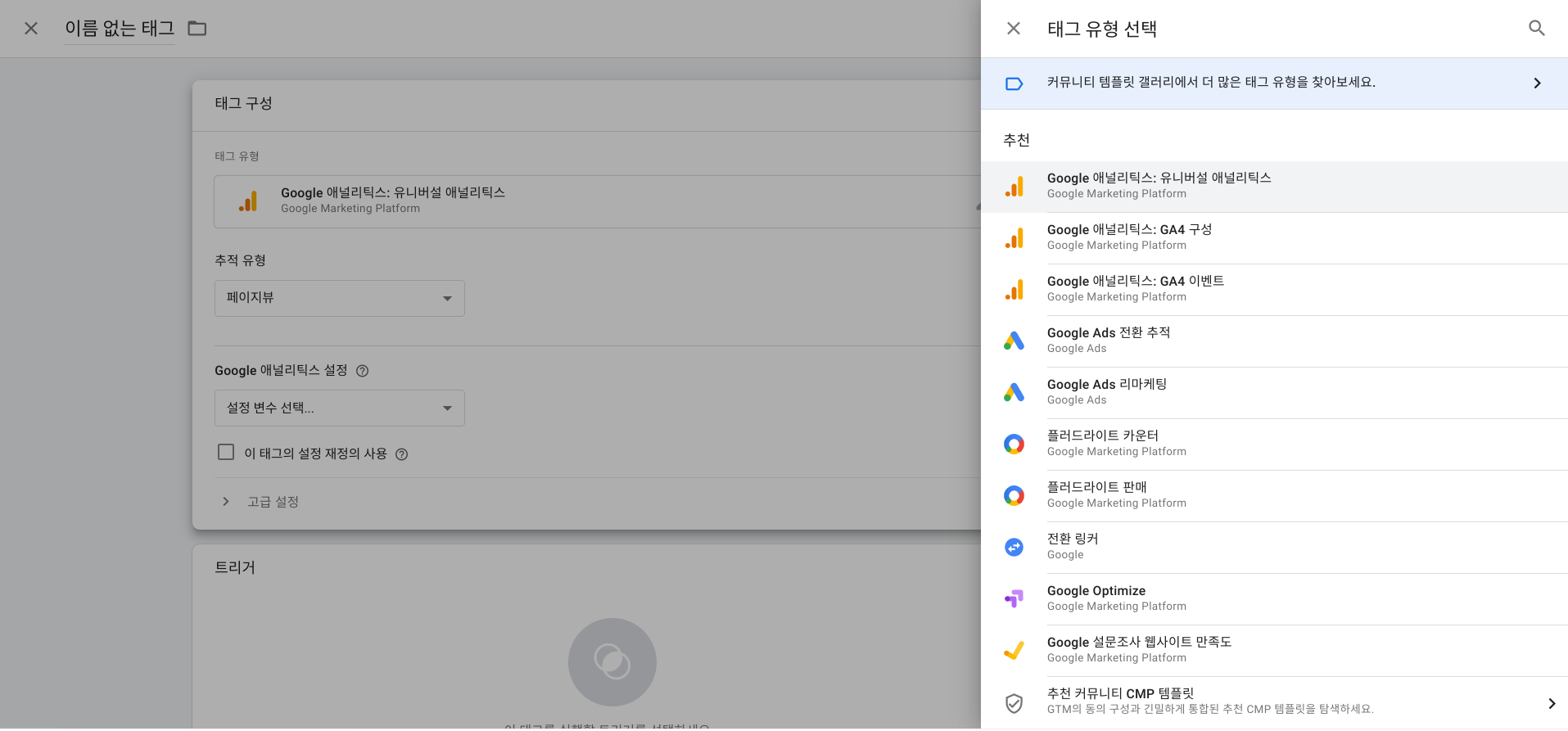 태그관리자 로그인 -> '태그' -> '새로 만들기' -> 태그 구성 -> 'Google 애널리틱스: 유니버설 애널리틱스' 선택