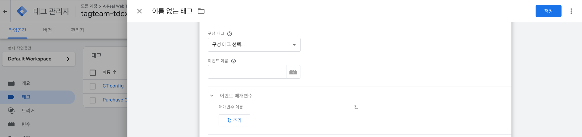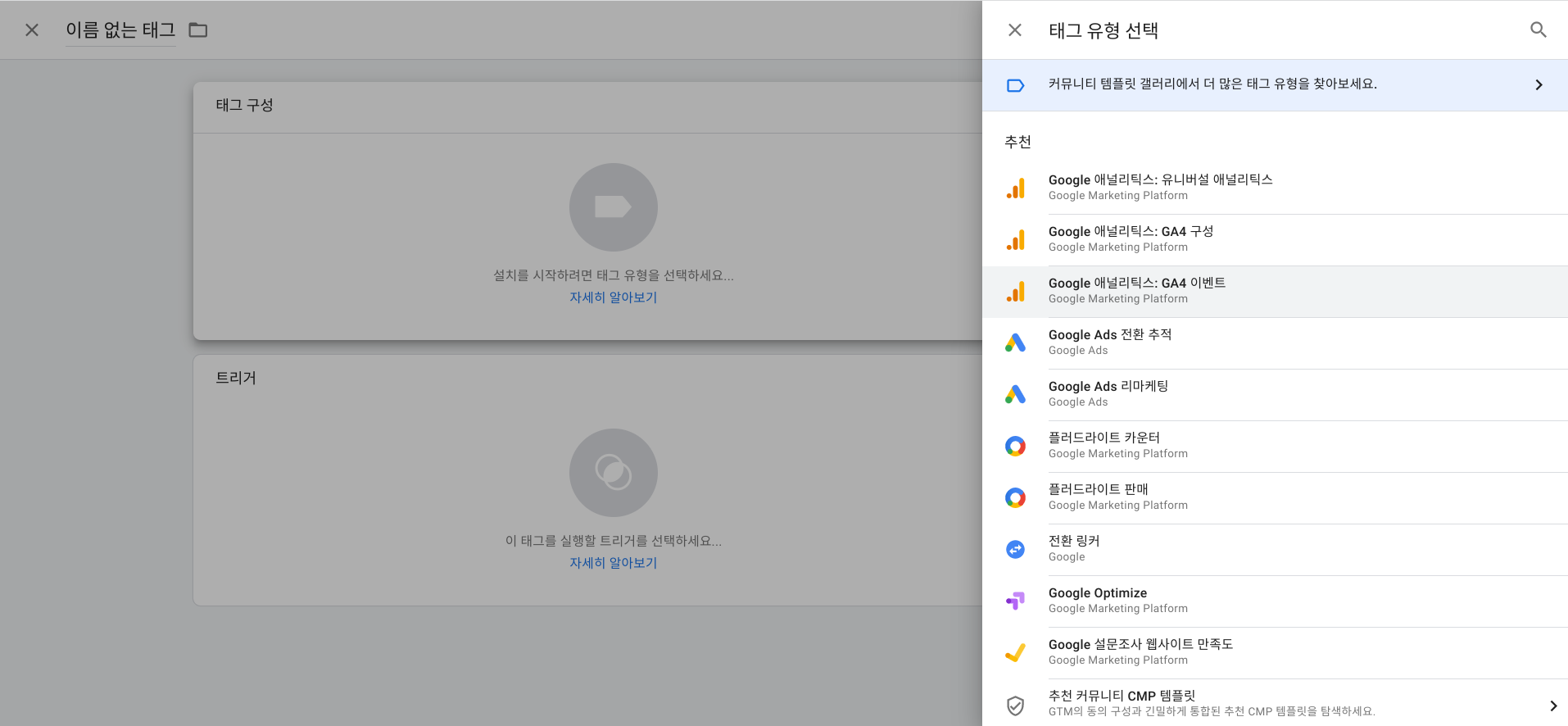 태그관리자 로그인 -> '태그' -> '새로 만들기' -> 태그 구성 -> 'Google 애널리틱스 GA4 이벤트' 선택