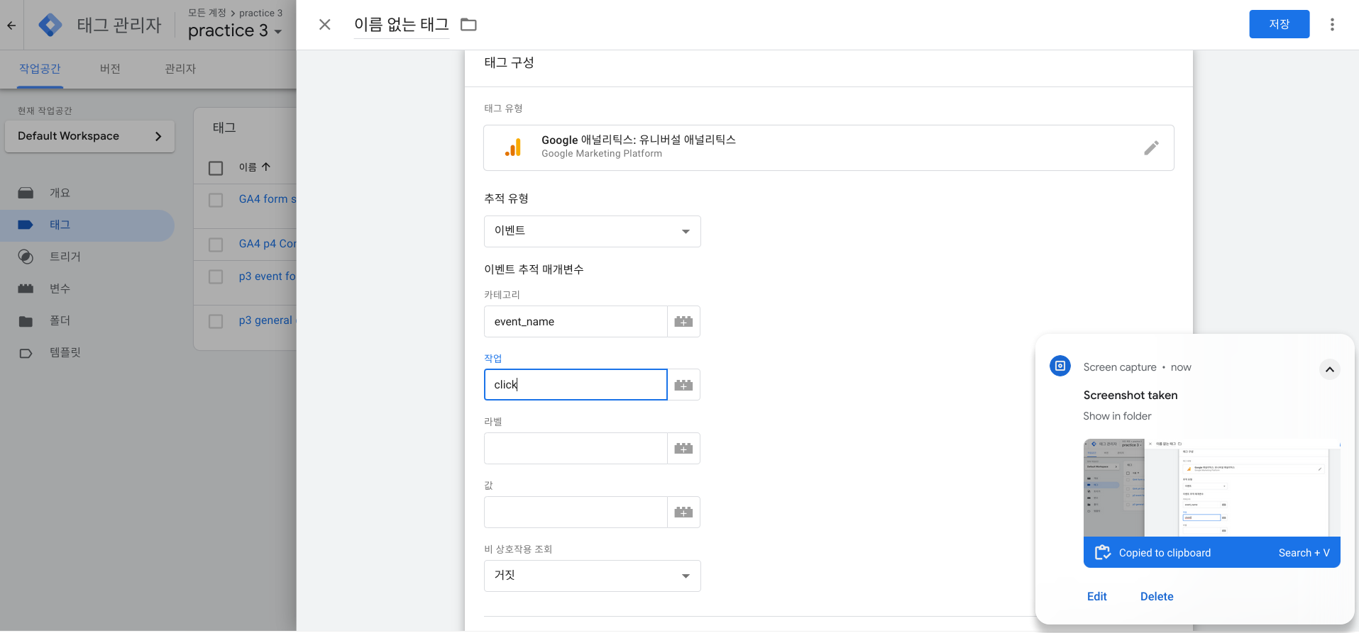 카테고리 (이벤트 이름)와 작업을 입력하고