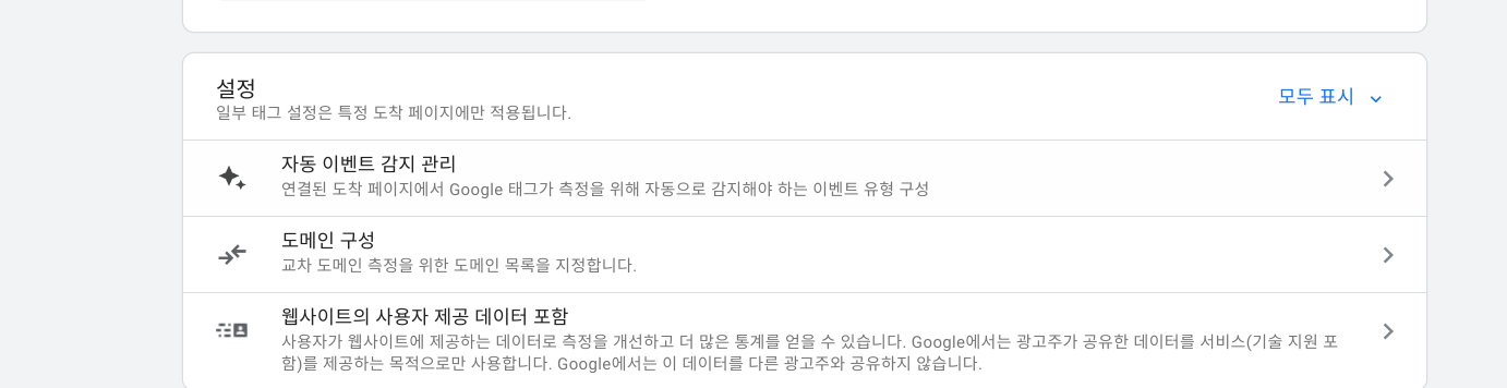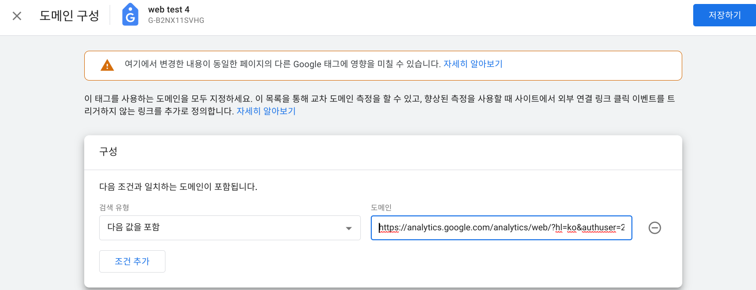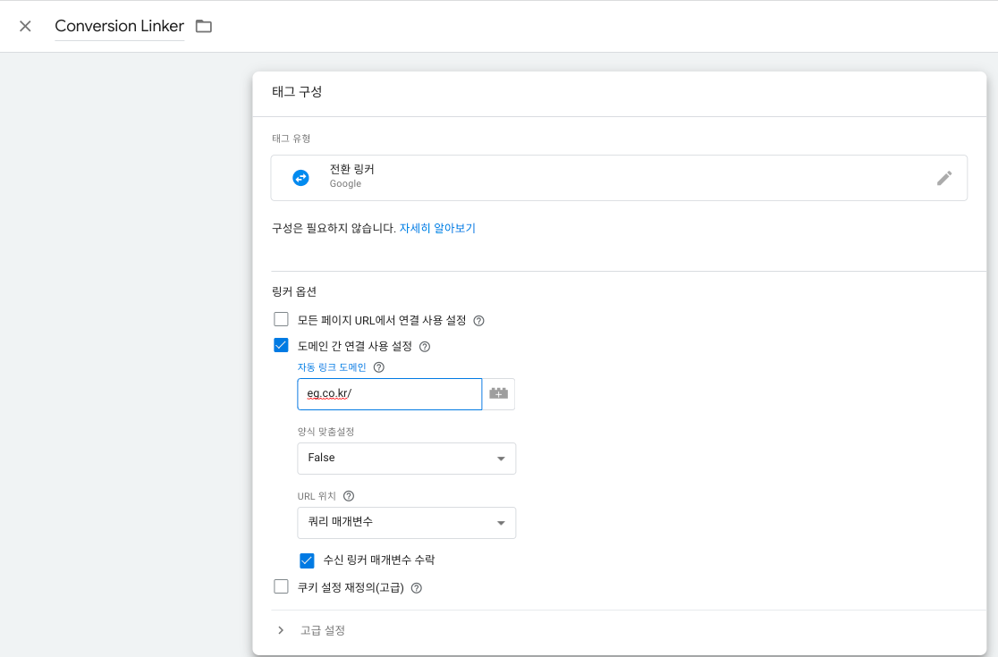 태그 구성 박스를 클릭하여 열고 '도메인 간 연결 사용 설정'을 선택 후 (들어오는 쿼리의 링커 매개변수를 체크하게 하는 옵션). 보조 도메인을 입력합니다.