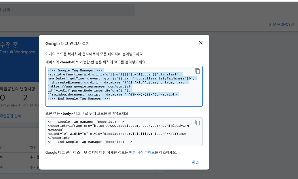 태그관리자가 작동하기 위해서는 사이트와 태그관리자를 연결하는 작업이 필요합니다.