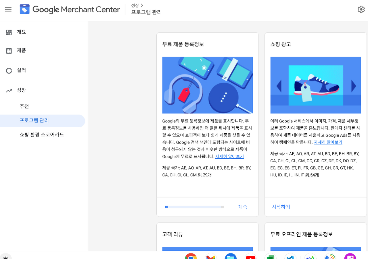 '성장' -> '프로그램 관리' -> 열린 화면에서 '쇼핑광고' '시작하기' 선택