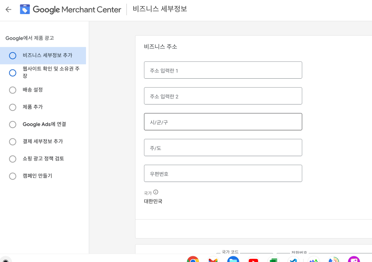 설정하기 '성장' -> '프로그램 관리' -> 열린 화면에서 '쇼핑광고' '시작하기' 선택 좌측에 메뉴를 하나씩 체크해 나가면 되는데요. 1. 비즈니스 세부정보 추가 주소를 입력하고 저장합니다. 전화번